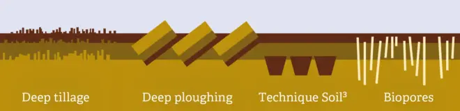 While the Soil³ technique, deep ploughing, deep tillage, and crumb deepening are particularly beneficial for sandy soils in north-eastern Germany, creating biopores is more suitable for clay soils. All these methods are costly and energy-intensive. General recommendations are difficult because of the significant natural variability of the subsoil, even within a single field.